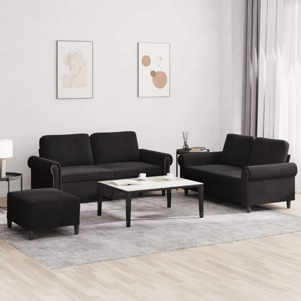 Set Divano in Velluto Nero 100% Poliestere con Struttura in Metallo e Compensato Textilene per Soggiorno
