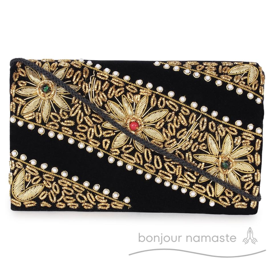 Black Velvet Designer Sling Ladies Purse 100% Handmade Beaded Embroidery Zari Work Open Evening & Party Use Bonjour Namaste