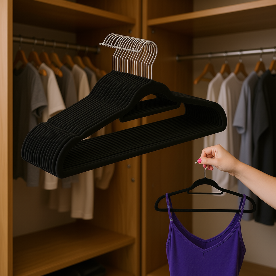 Black Velvet Fabric Hangers Pack 140 Non Slip Chrome Hook Sturdy Notched Shoulders Portable Wardrobe Clothing Organizer