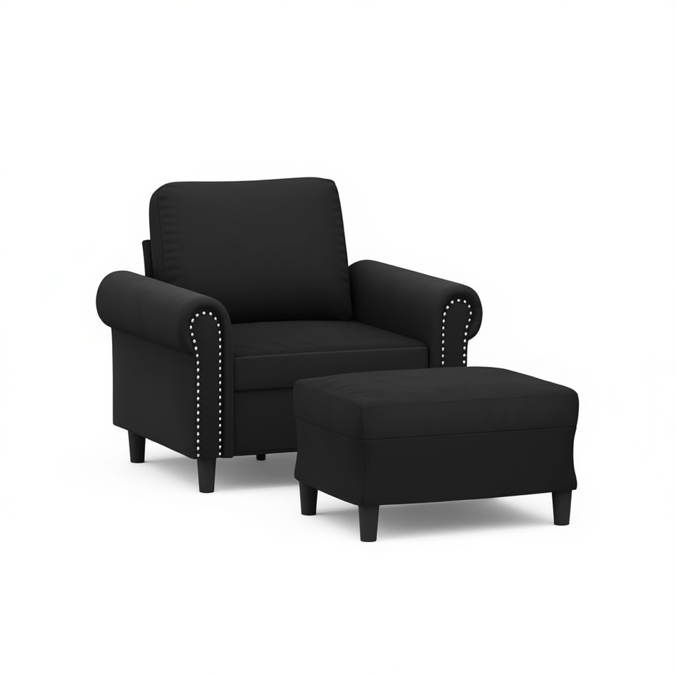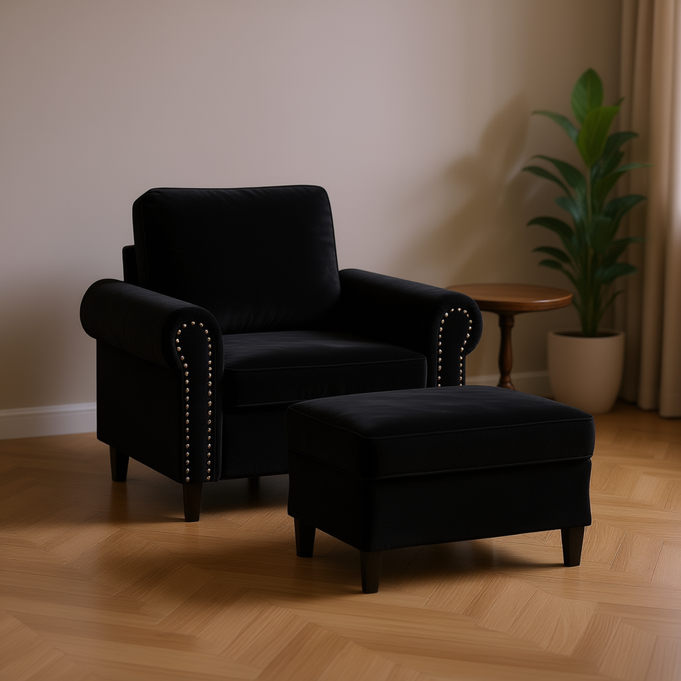 Poltrona Singola in Velluto Nero con Poggiapiedi, Elegante Arredo per Soggiorno, Schienale Stretto, Braccioli Arrotolati, Gambe in Legno