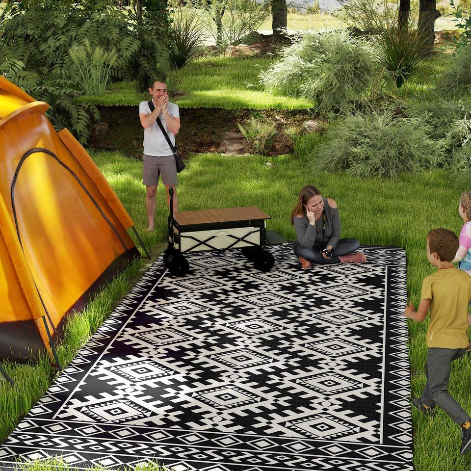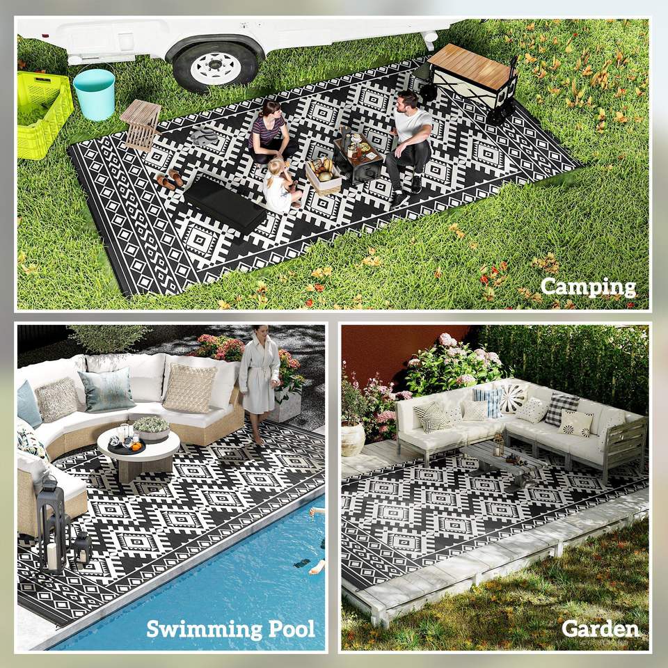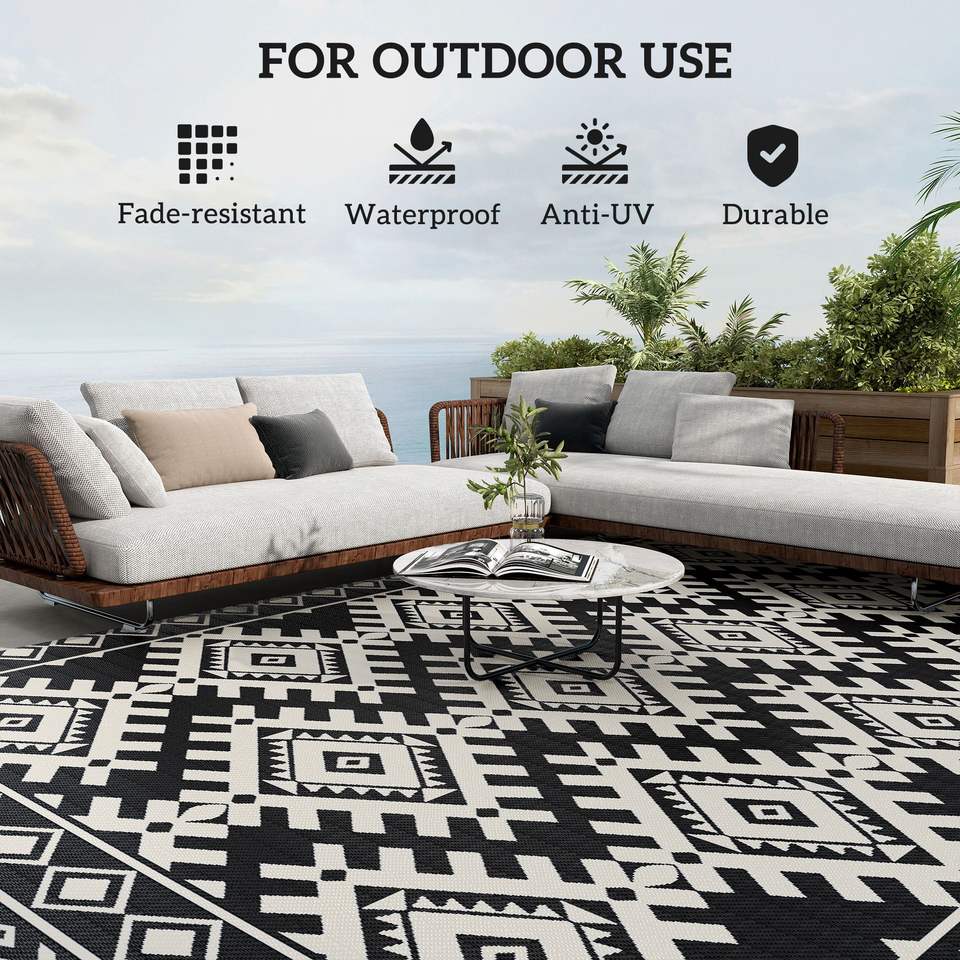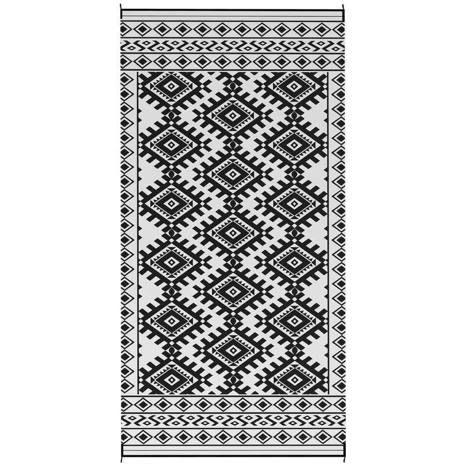 Black & White Reversible Outdoor Rug 9' X 18' Waterproof Plastic Straw with Carry Bag Rhombus Border
