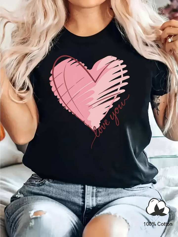 Black Women's T-Shirt Heart Print Short Sleeves Crew Neck Casual Spring Summer 100% Cotton Jersey Comfortable Regular Fit