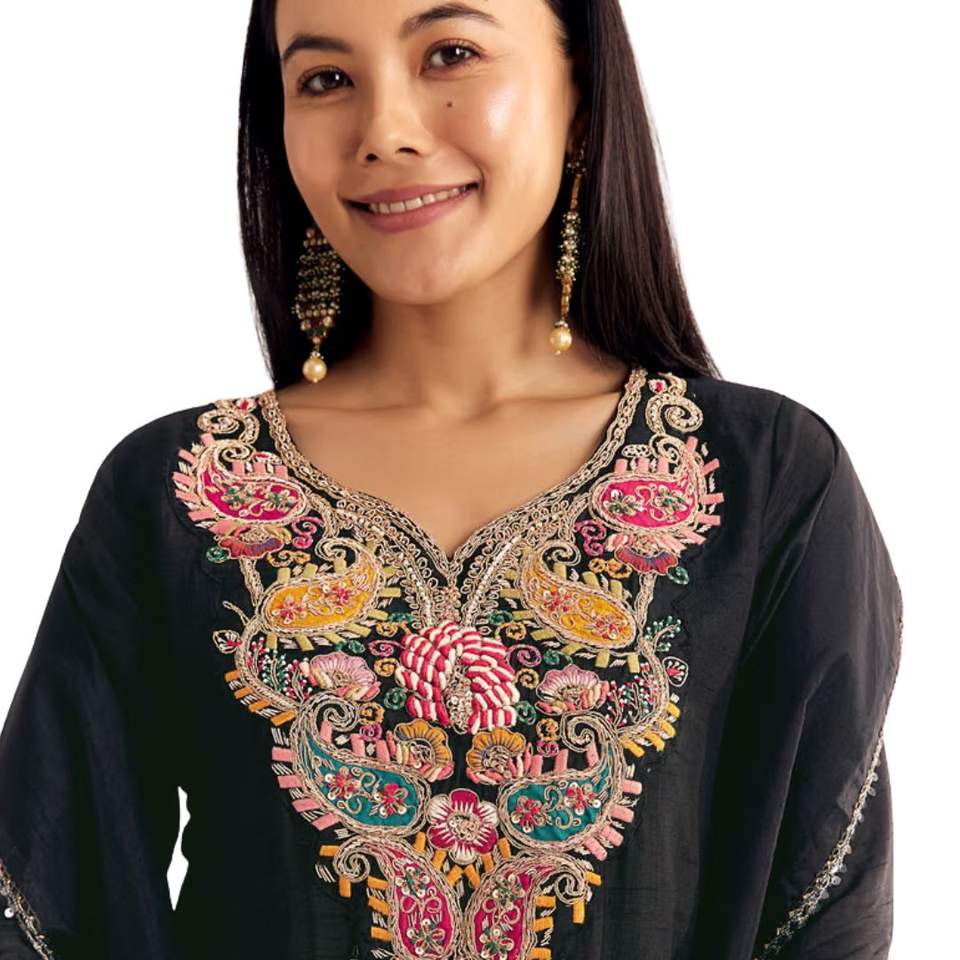 Nero Zardosi lavoro Dola seta Kurta Palazzo vestito con Organza Dupatta all'ingrosso donna abbigliamento etnico OEM fabbrica fornitore di massa