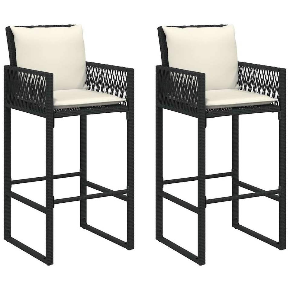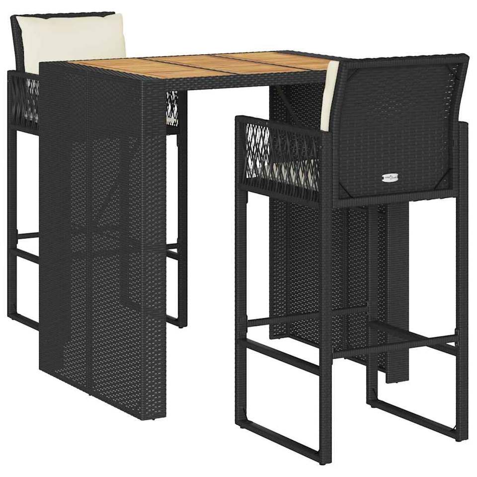 Set Bar da Giardino in Rattan Nero con Cuscini, 2 Posti, Arredamento da Esterno con Piano in Teak, Design Contemporaneo