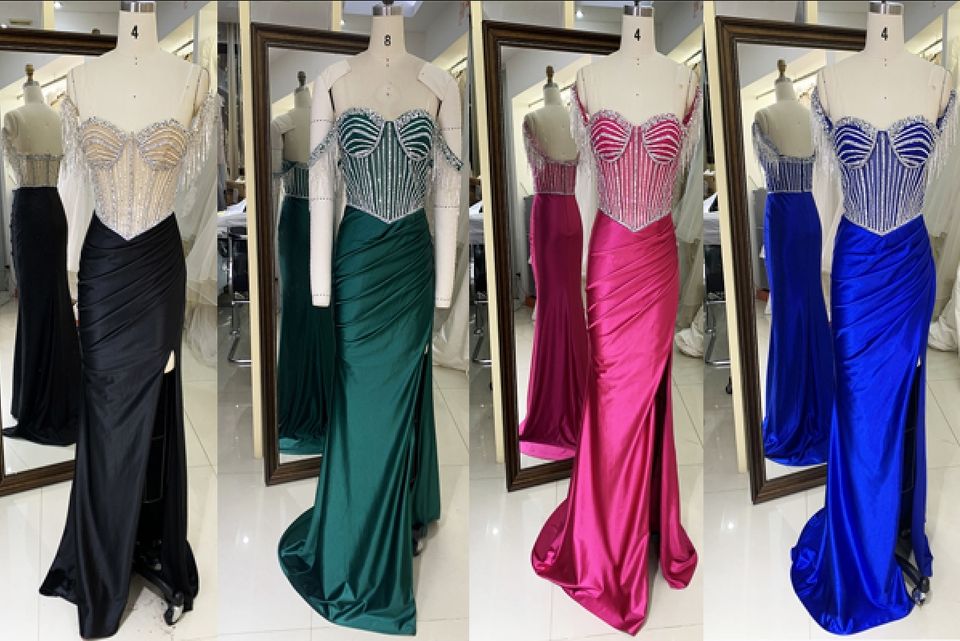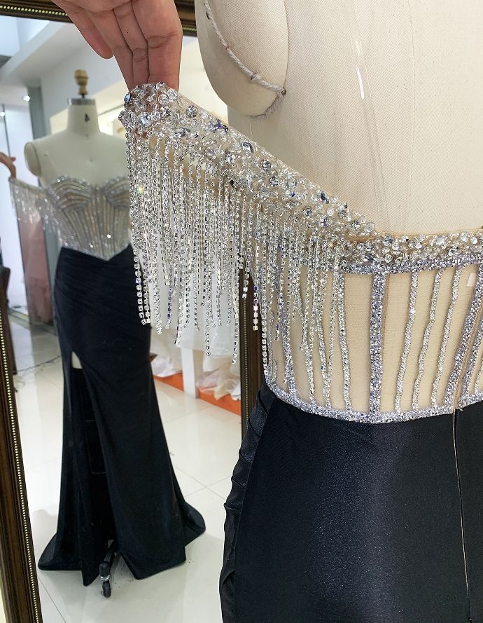 Black and Nude Tassel Sleeveless Beading Chain Corset Bodice Satin Hand Pleated Mermaid Dresses Wholesale Prom Dresses Black