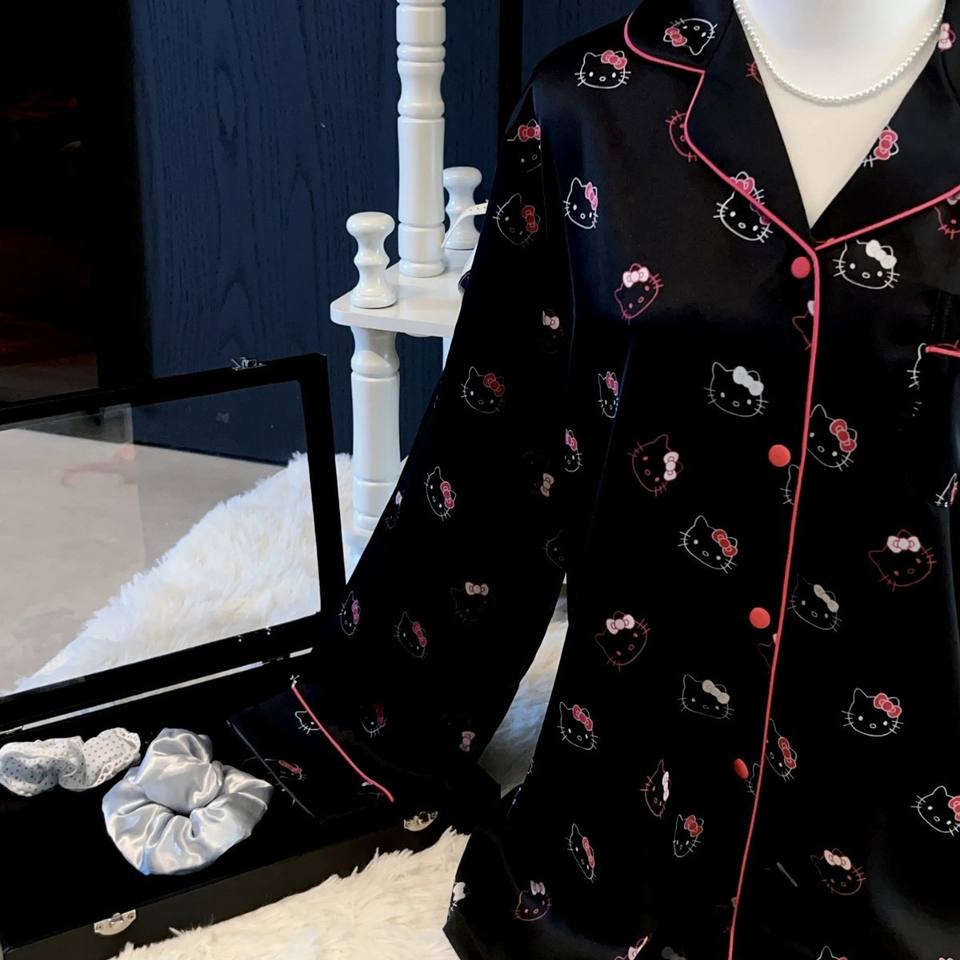 Black cat pajama woman with hair band 2026 Spring and fall cute homewear set three-piece