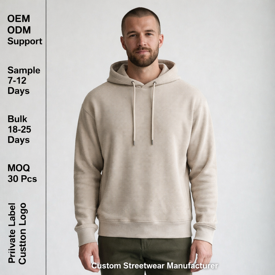 Felpa con Cappuccio Doppio da Uomo, Premium, Lusso, Basic, Vestibilità Ampia, Beige Avena, in Morbido Cotone Waffle