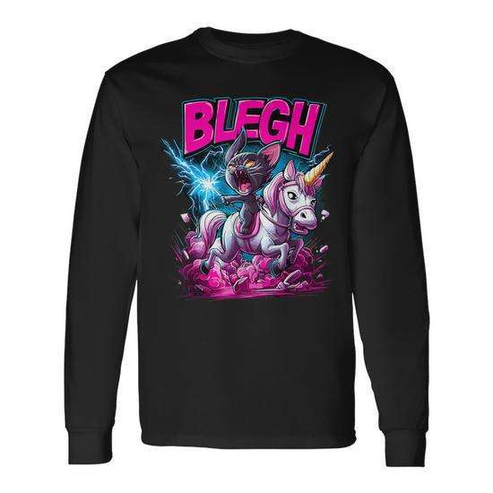 T-shirt a maniche lunghe Blegh con design grafico di gatto che cavalca un unicorno, abbigliamento unisex