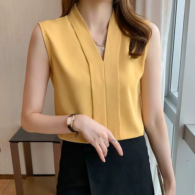 Blouses Women Summer Sleeveless Tank Top V-Neck White Shirt Female Elegant Solid Color Office Lady Chic Blouse