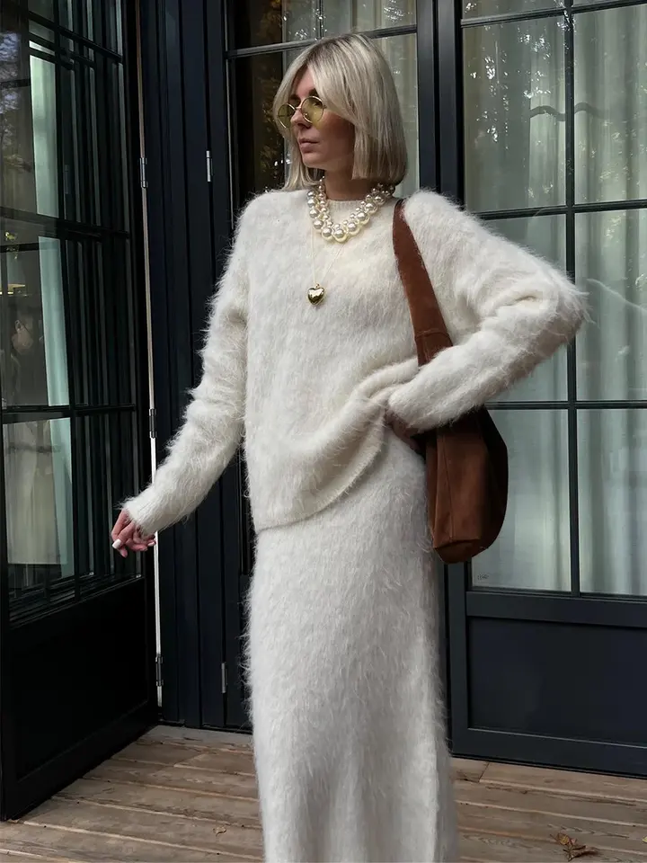 Blubelle Winter Fashion 2-Piece Knitted Outfit Women Oversized Pullover High Waist Skirt Casual Streetwear Ankle Solid ELEGANT