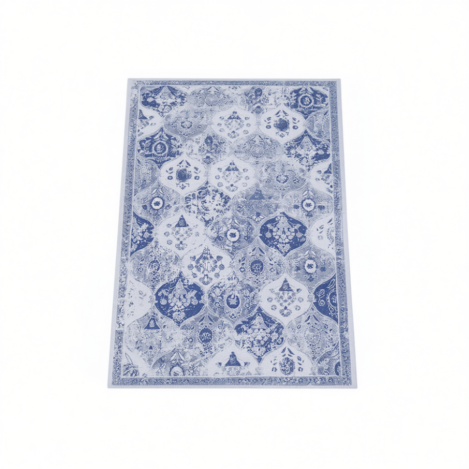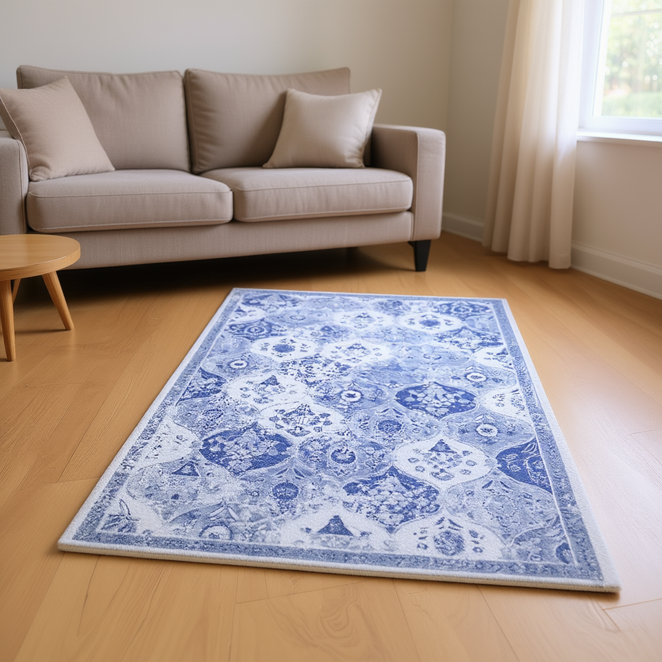 Blue Patterned Medallion Area Rug 5x8 Low Pile Washable Non Shedding Rubber Backing Living Room Bedroom Kitchen Dining Room