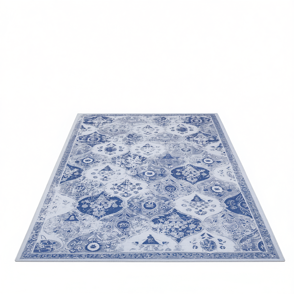 Tappeto Rettangolare Blu Medaglione 9x12 a Pelo Corto con Base in Gomma, Stile Classico per Soggiorno, Camera da Letto e Sala da Pranzo
