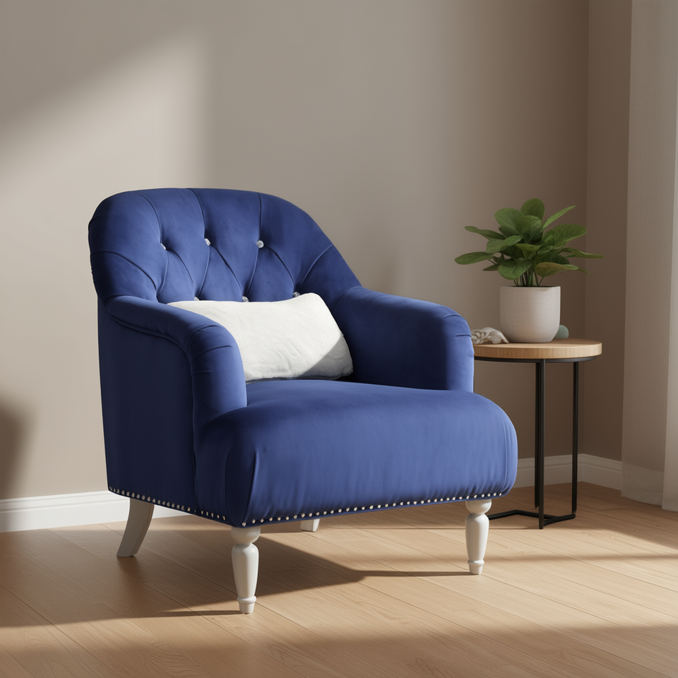 Poltrona Singola in Velluto Blu con Schienale Trapuntato e Gambe in Legno per Soggiorno