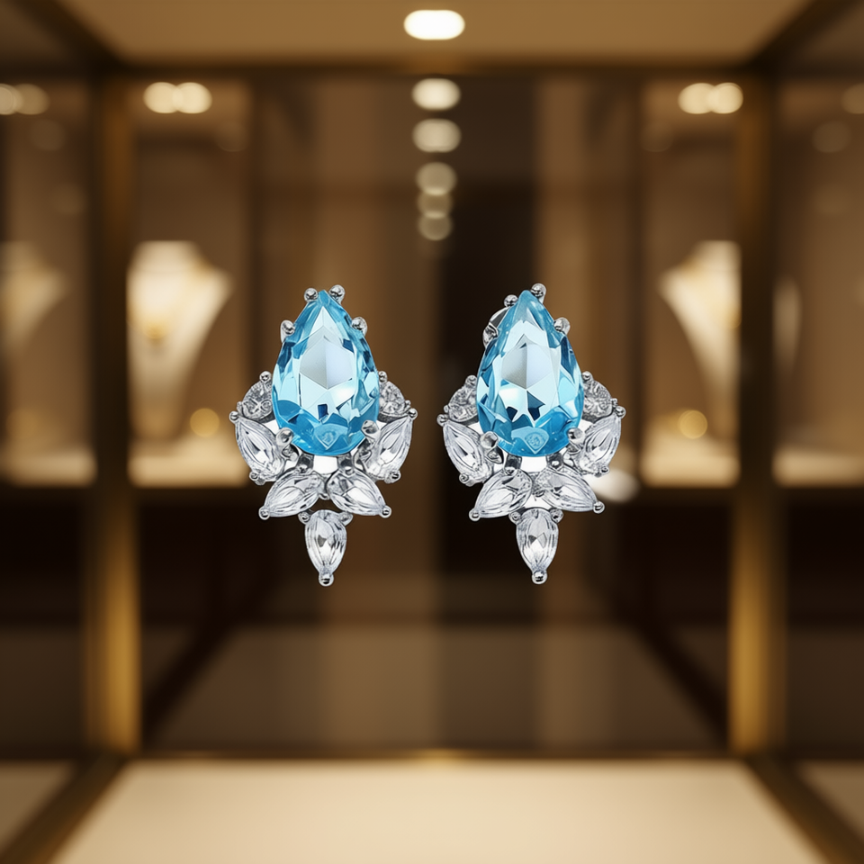 Blue Pear Cut Crystal Stud Earrings Flower Design Claw Setting Romantic Women's Fashion Jewelry Party Accessory