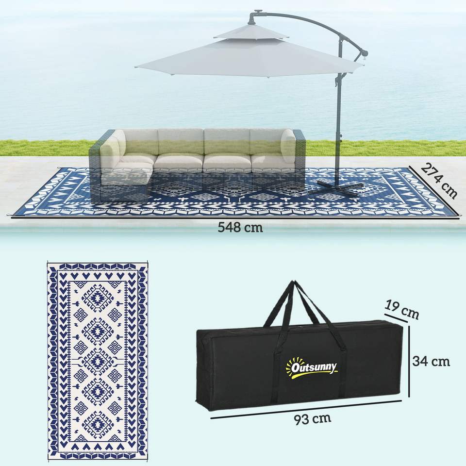 Tappeto da esterno reversibile blu e bianco 9 'X 18' paglia di plastica impermeabile con borsa da trasporto Patchwork Design