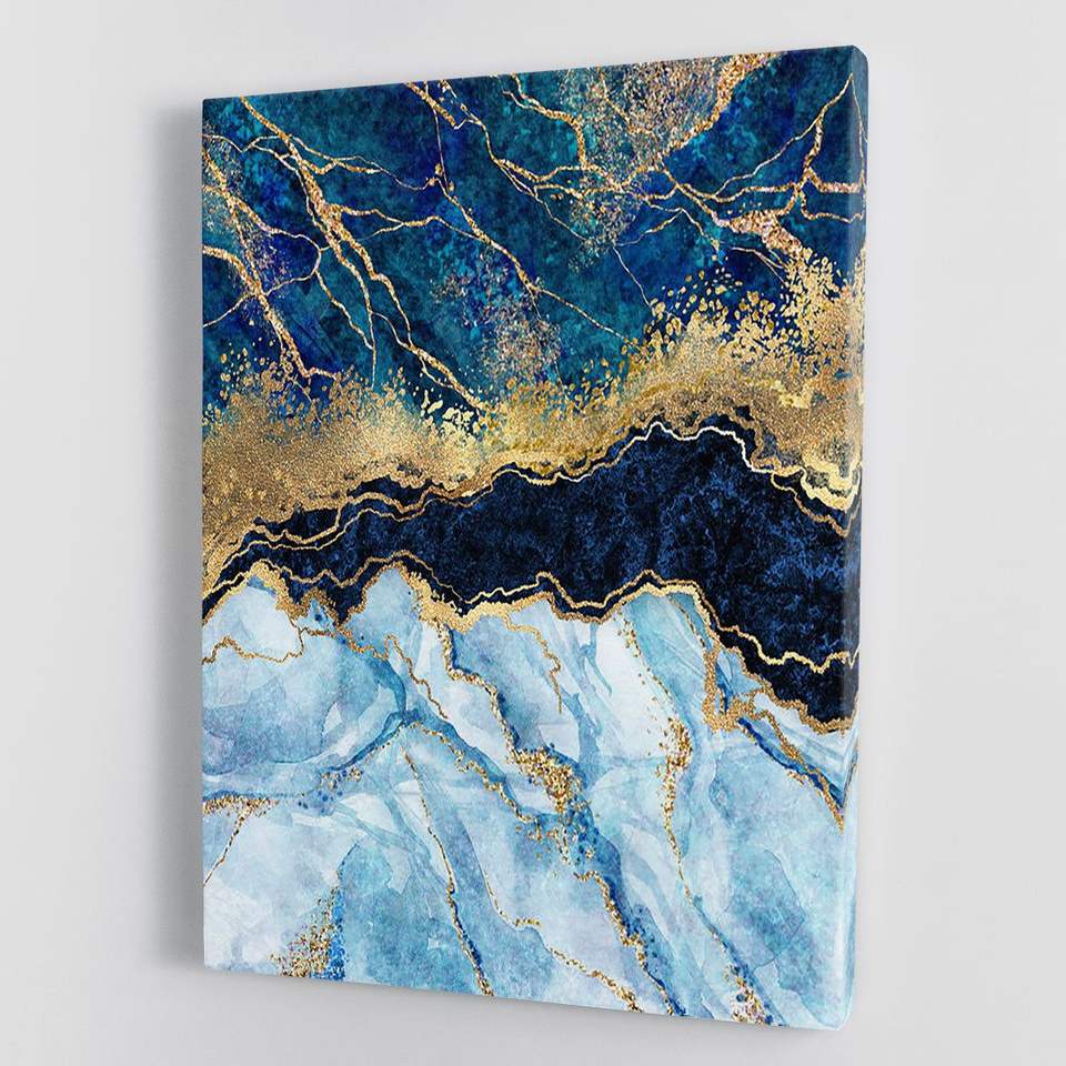 Stampa su tela o poster con marmo a strati blu e oro, elegante tappeto e set coordinato