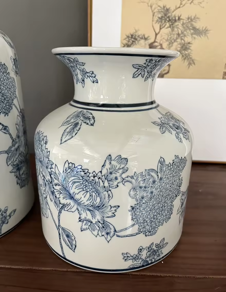 Vaso in ceramica blu e bianco tradizionale in stile cinese con grazioso motivo a flora come abito decorativo in ufficio e casa
