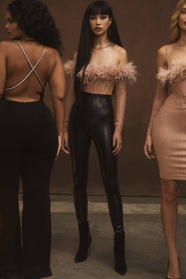Arrossire i body con piume sulle spalle per le tute da donna a maniche lunghe