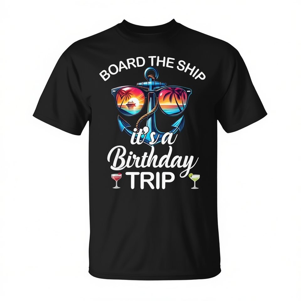T-shirt unisex a maniche corte con stampa digitale, girocollo, per adulti, con stampa 'Board the Ship Its a Birthday Trip Cruise'