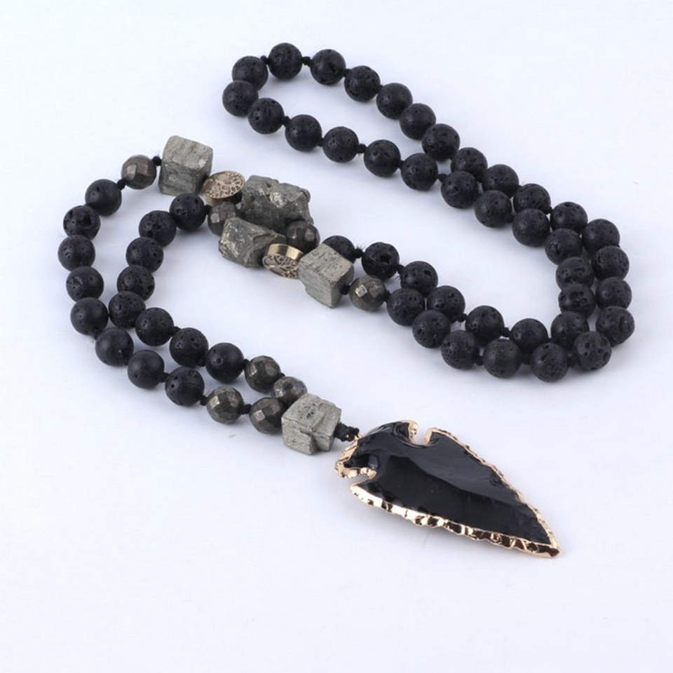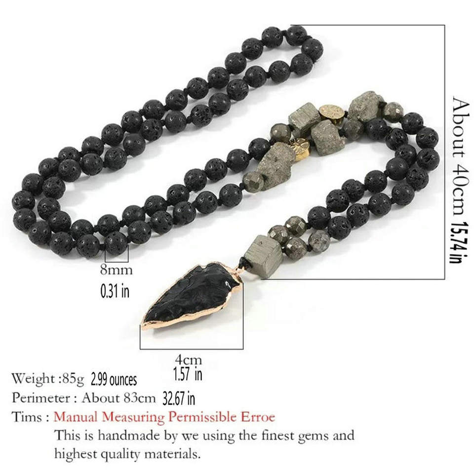 Bohemia Lava Rock Beaded Necklace for Men Jewelry Healing Meditation Obsidian Arrow Pendant Knotted Natural Pyrite Necklace