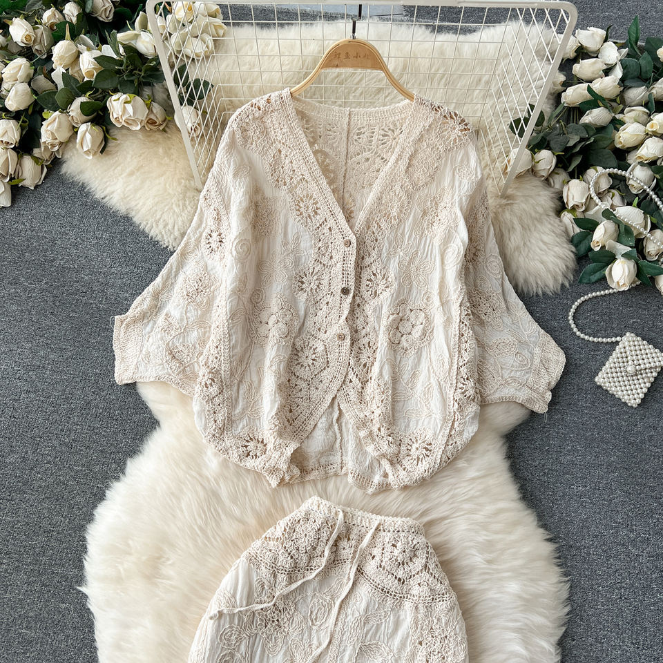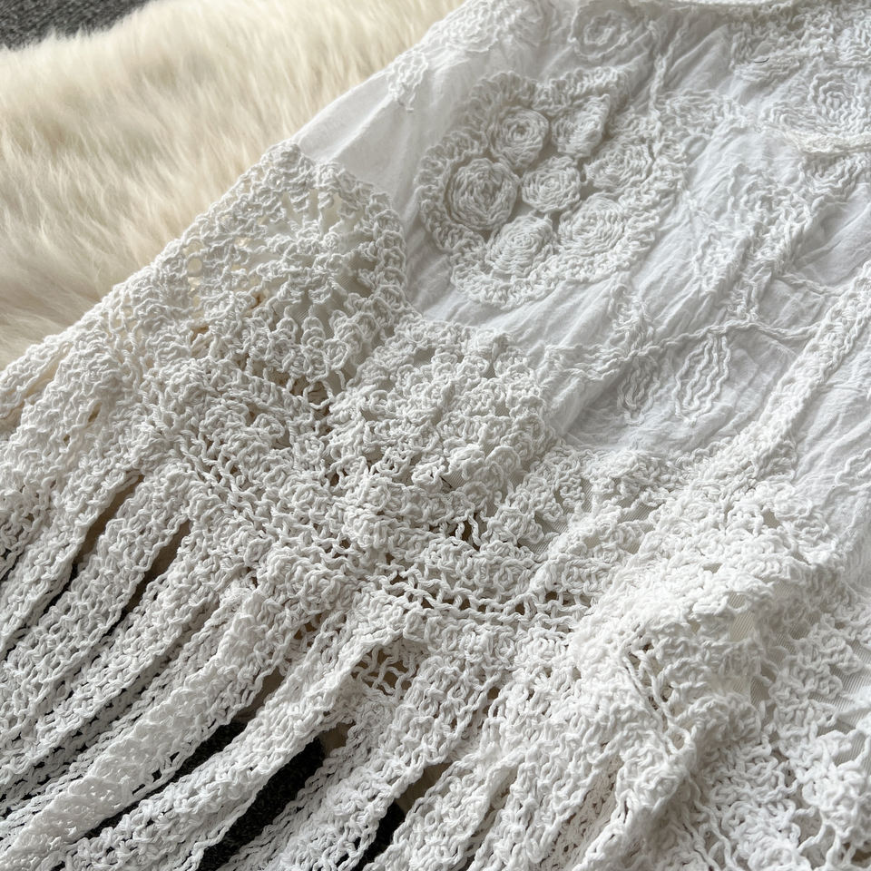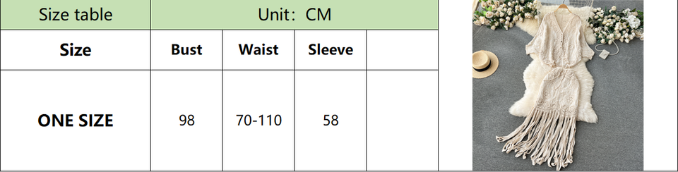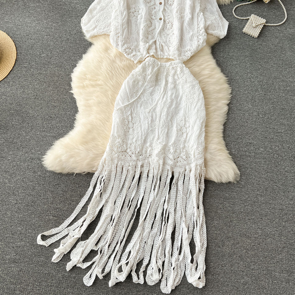 Set in Stile Bohémien Retrò per le Vacanze, Cardigan con Ricami Elaborati e Gonna con Frange Decorative
