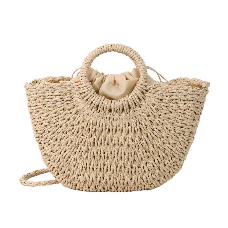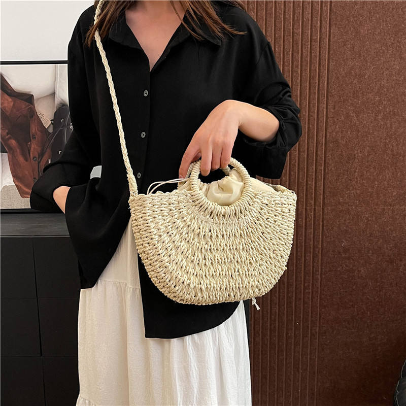 Borsa a Mezzaluna in Stile Bohémien Intrecciata a Mano in Rattan con Chiusura a Coulisse per Donne, Ideale per Vacanze Estive in Spiaggia
