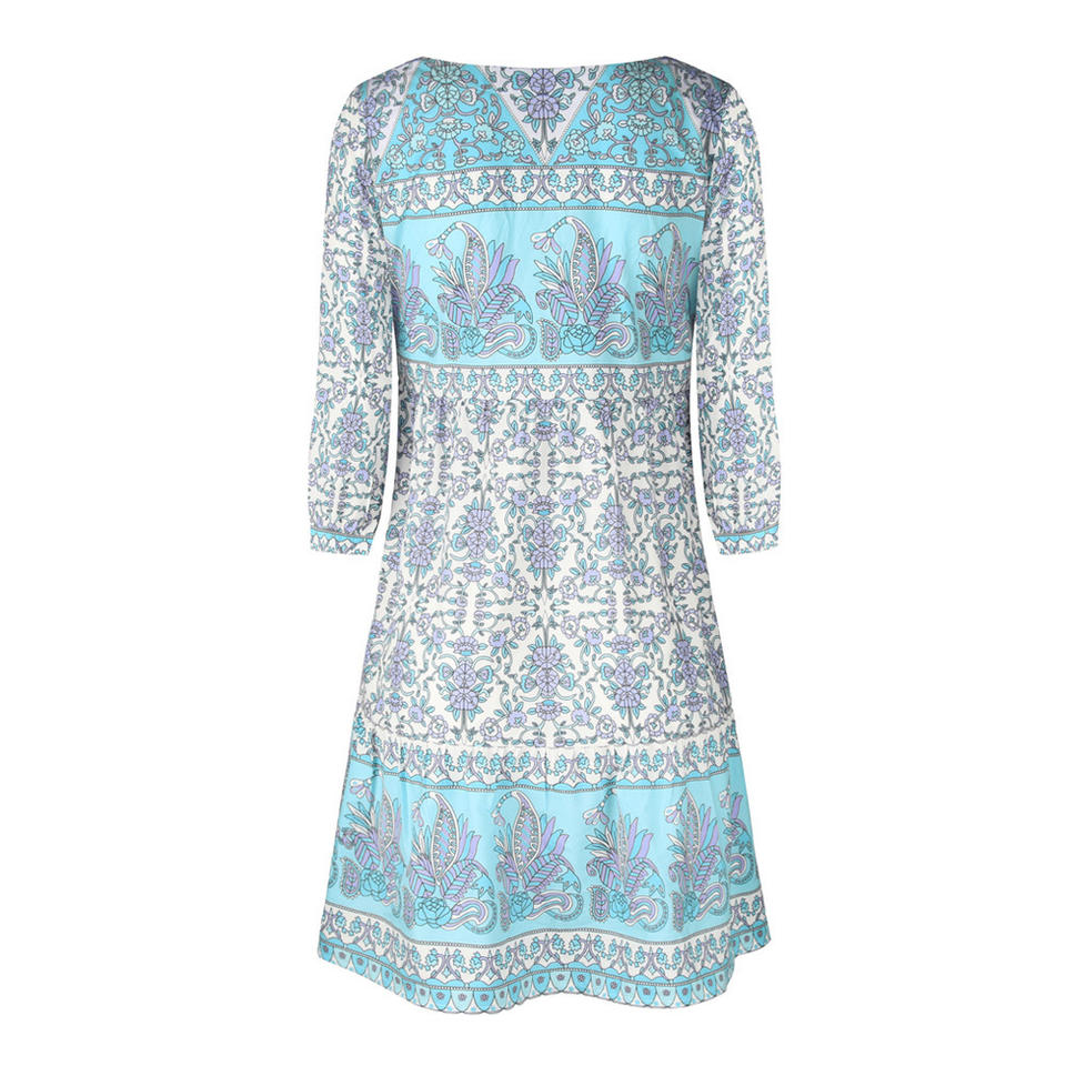 Mini abito boho con stampa floreale blu, scollo a V, maniche a 3/4, abiti da donna, nuova stagione, stile estivo, abiti da spiaggia bohémien EBAH002