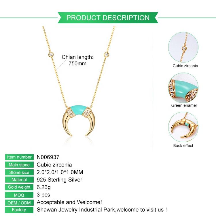 Boho Sterling Silver Enamel Jewelry, Gold Buffalo Tusk Horn Crescent Moon Long Necklace
