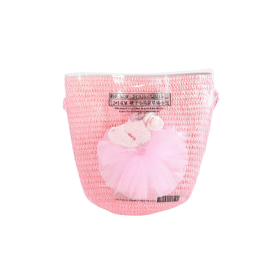 Borsa di paglia stile pony per bambini 12x14cm con fiore in tulle