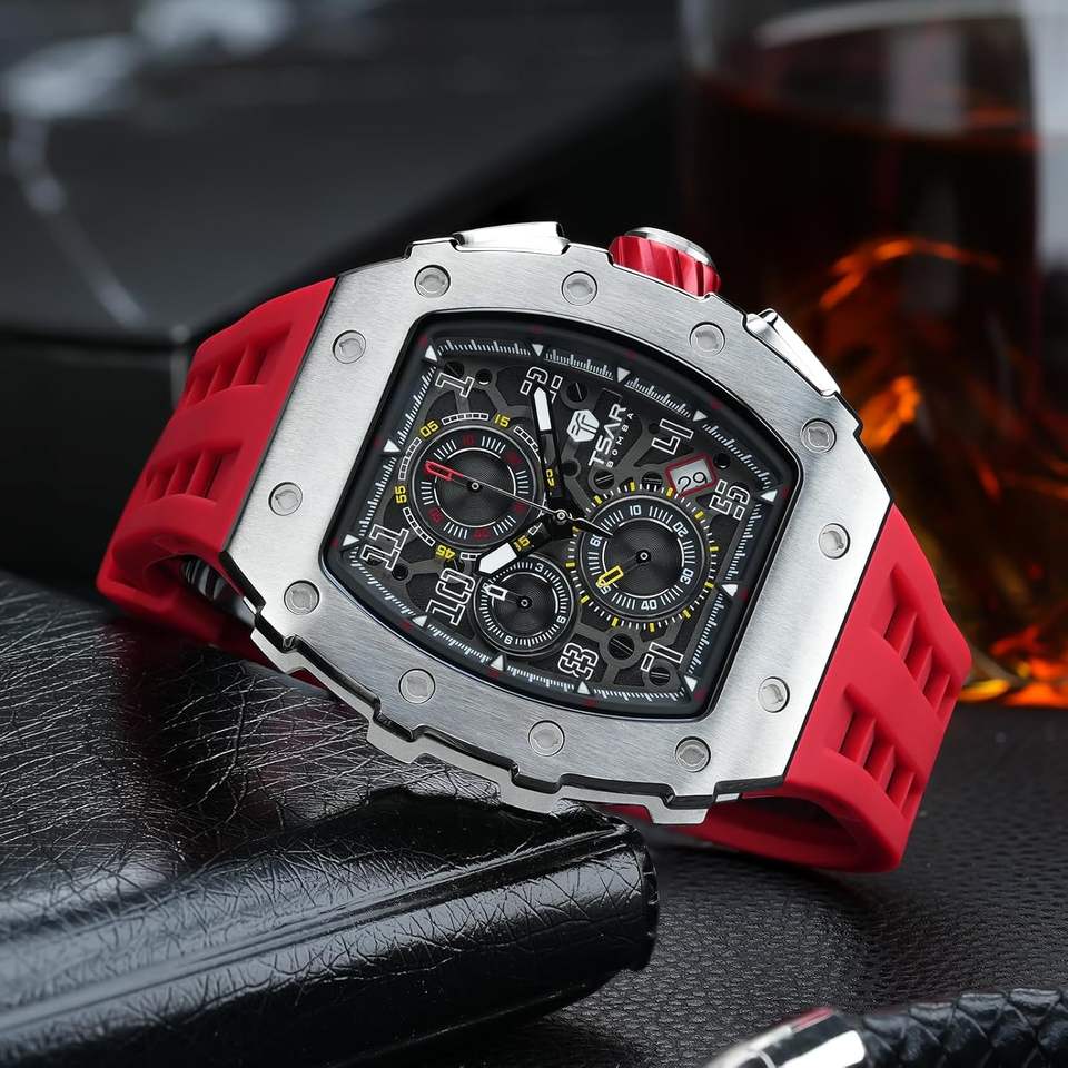 Bomb Luxury Men's Square Tonneau Watch 50M Waterproof Quartz Movement Chronograph 20mm Rubber Band Acrylic Case