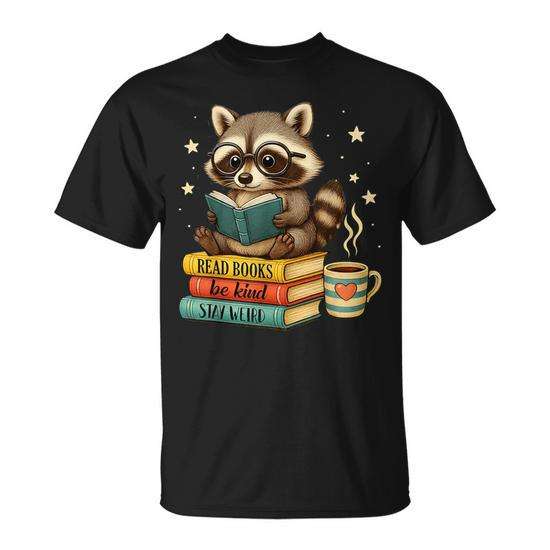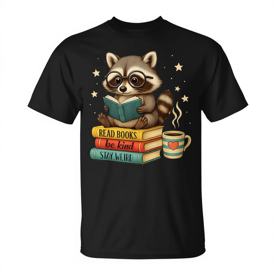 T-shirt per amanti dei libri con procione che legge, T-shirt promozionale Be Kind