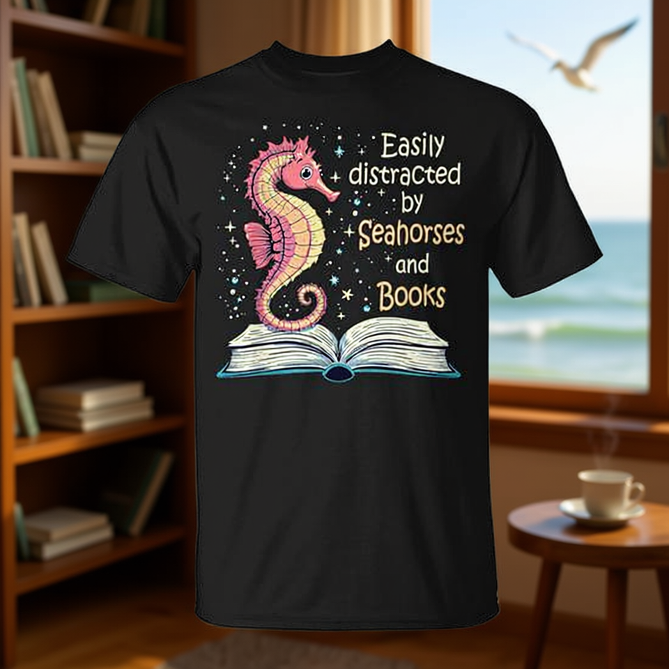 T-shirt per amanti della lettura che si distrae facilmente da cavallucci marini e libri, per gli amanti dei libri e gli appassionati di creature marine