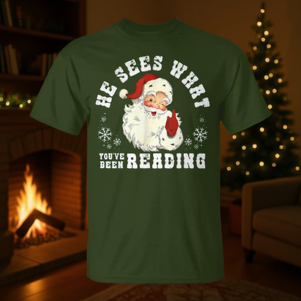 Bookish Christmas Lui vede ciò che stavi leggendo Maglietta di Babbo Natale