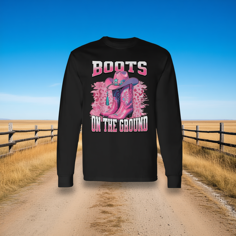 T-shirt a maniche lunghe con stivali da cowboy western rosa leopardati sul fondo della maglietta