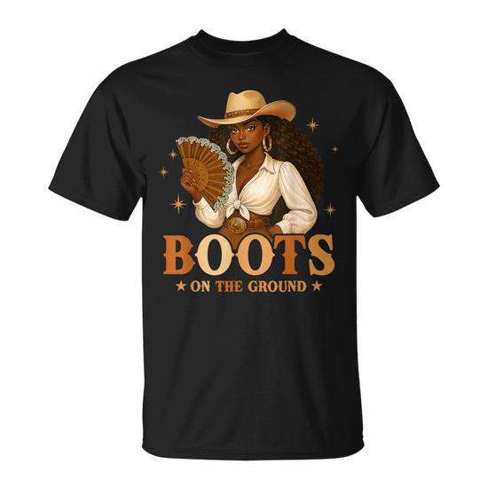 T-shirt da donna girocollo a maniche corte con stampa digitale Boots on the Ground Juneteenth Black Cowgirl per uso promozionale