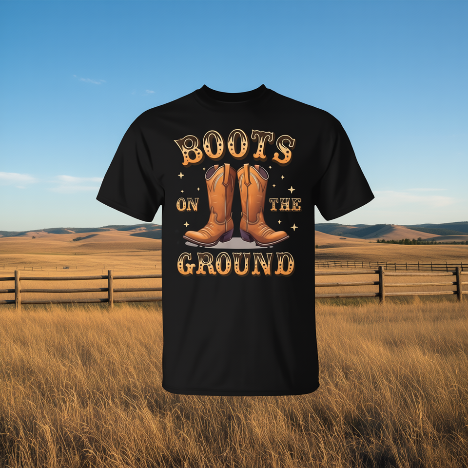 T-shirt Boots On The Ground con design a stivali da cowboy, abbigliamento unisex in cotone nero