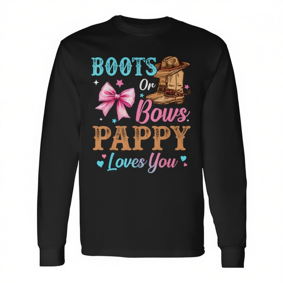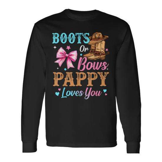 Maglietta a maniche lunghe con stampa 'Boots or Bows Pappy Loves You Family' per Gender Reveal, abbigliamento promozionale