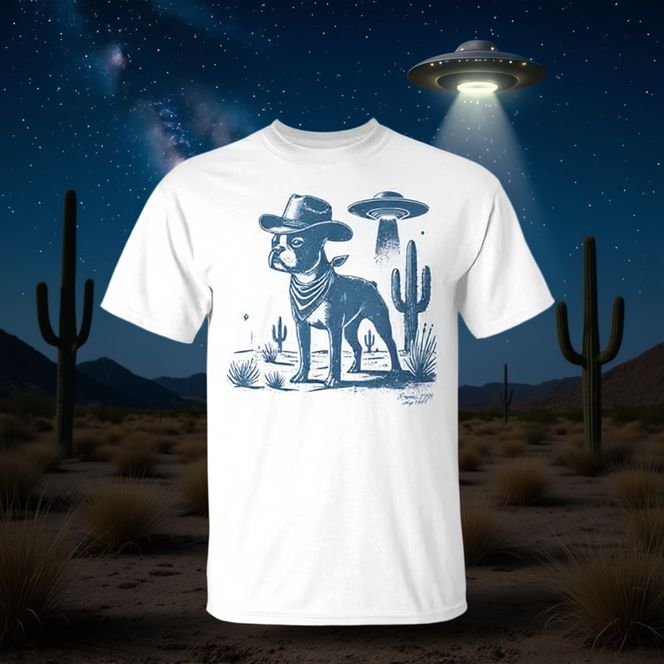 Boston Terrier Alien Dog T-Shirt for Dog Mom and Dad Featuring Cowboy and UFO Themes for Dog Lovers