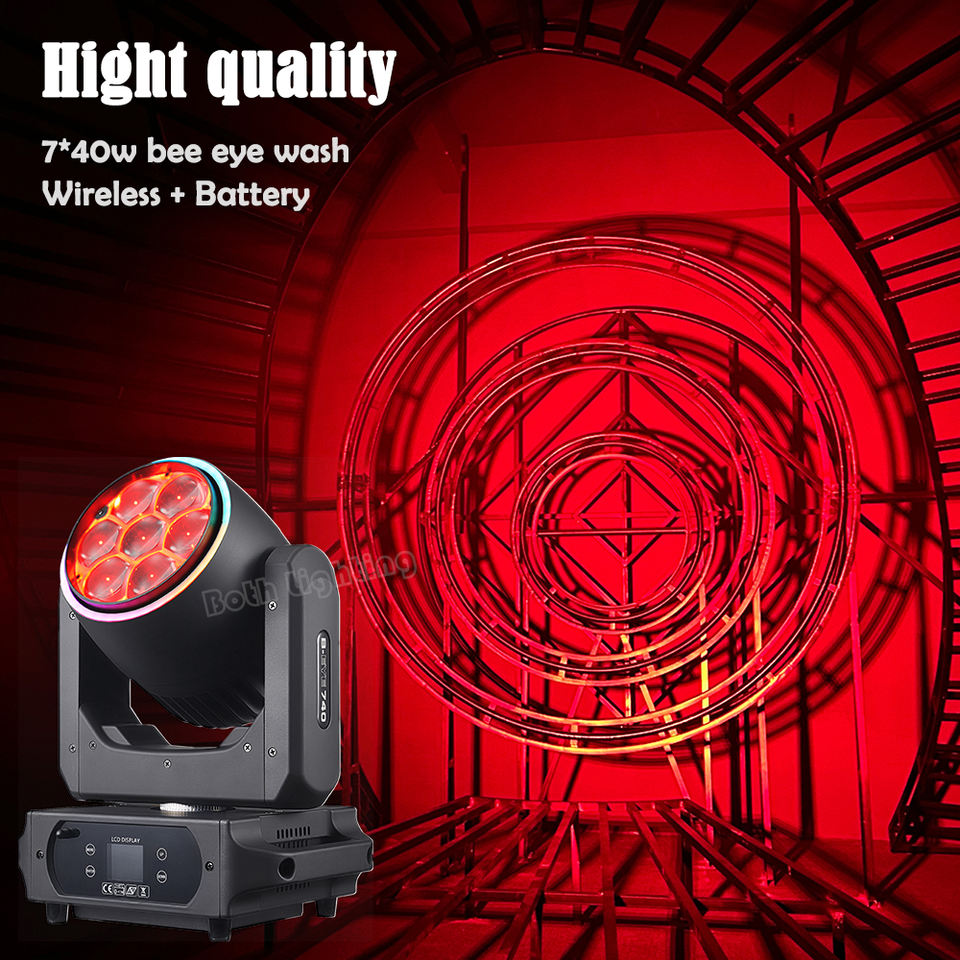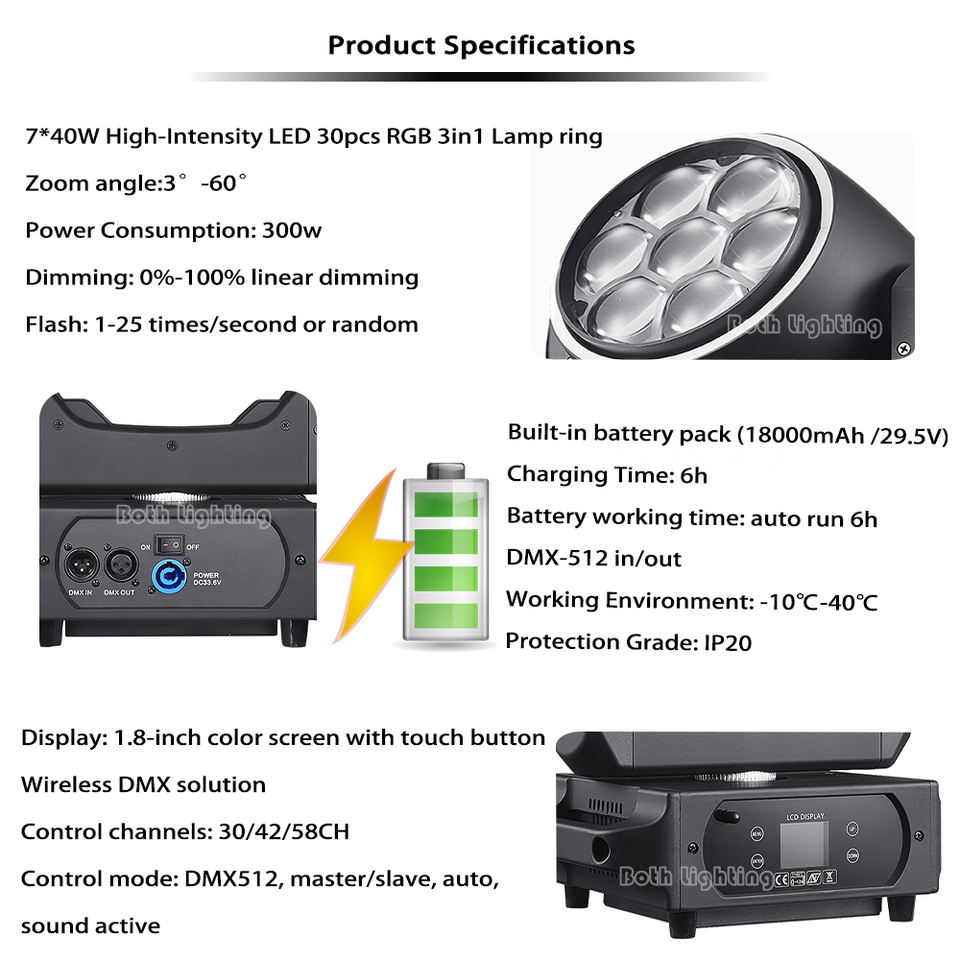 Fari mobili Both Lighting BPM Splash X, Faretto singolo bianco 7*40W Bee Eye, Batteria wireless, Effetto arcobaleno, per matrimoni, DJ, feste