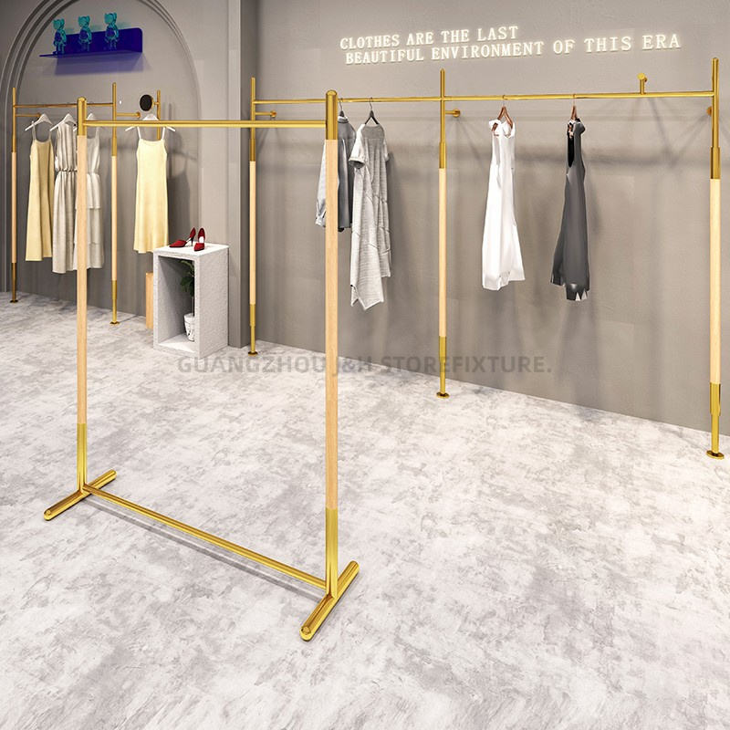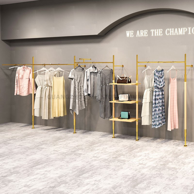 Gli scaffali dorati della parete dell'esposizione dello scaffale di esposizione dei vestiti fissato al muro della Boutique appendono l'acciaio inossidabile per il negozio di abbigliamento