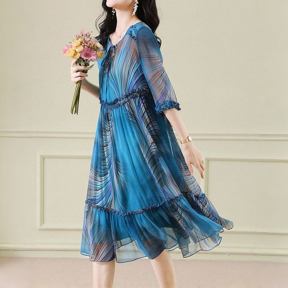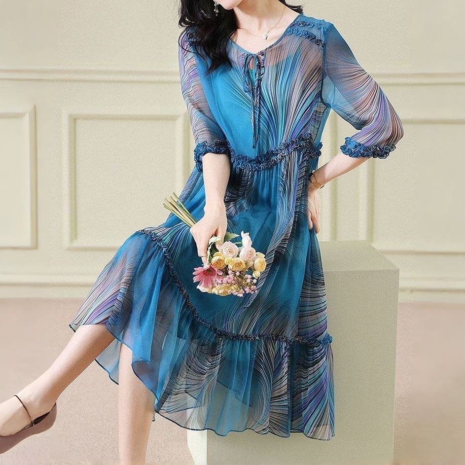 Boutique Wholesale Romantic Elegant Casual Women's Summer Dress Breathable Midi Length Chiffon Natural Printed A-Line Long