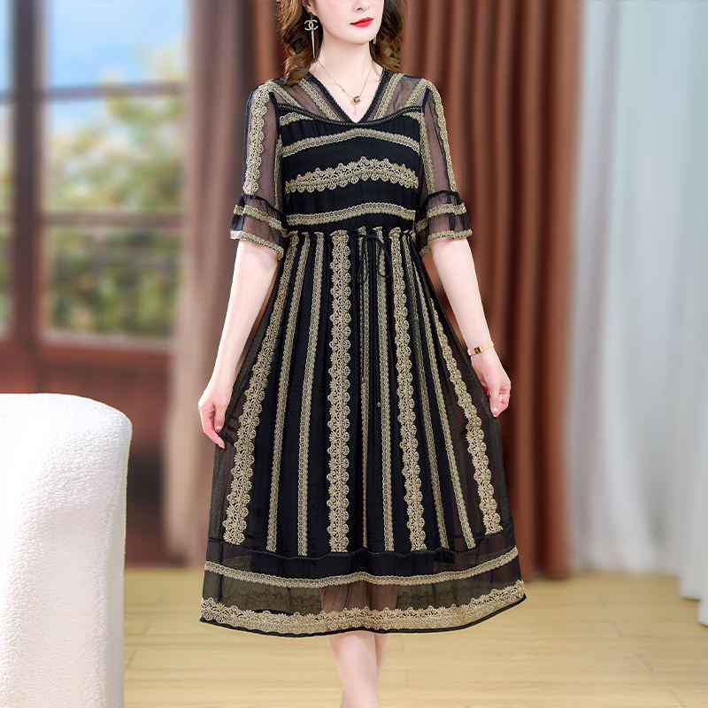 Boutique Wholesale Women's Summer Dress Fashionable Embroidered V-Neck Flare Sleeve Sweet Style Midi Length A-Line Silhouette