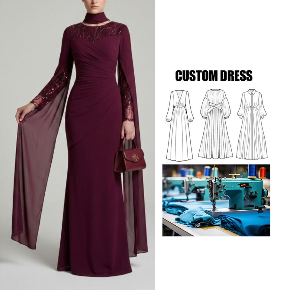 Abito da Ballo da Donna con Paillettes e Maniche Lunghissime Personalizzato dal Brand, Vestito da Sera Musulmano Sobrio per Banchetti e Feste di Gala