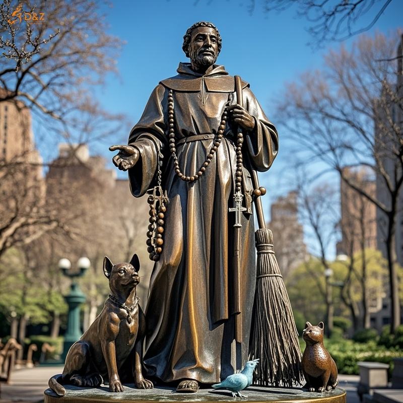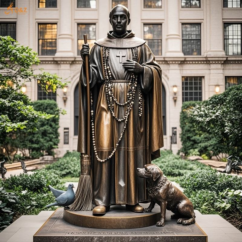 Brass Cast Holding Broom Crucifix People and Animal Racial Harmony Patron Saint Life Size St Martin De Porres Bronze Statue