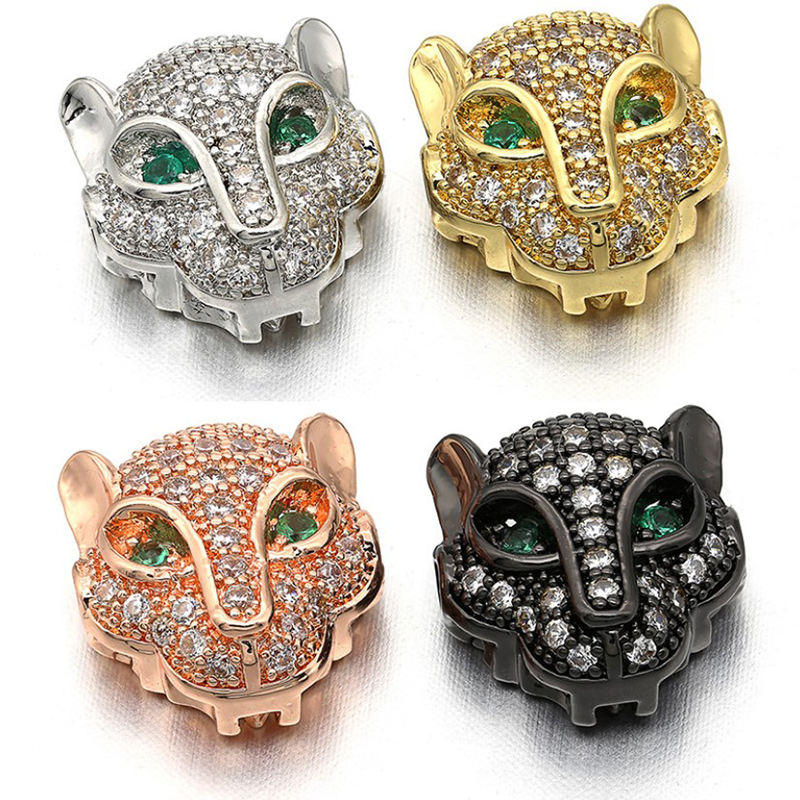 Perla in Ottone con Micro Pavé di Zirconia Cubica, Testa di Leopardo con Occhio Verde in CZ, per Creazione di Gioielli e Bracciali