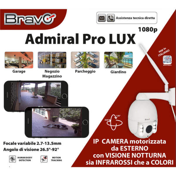 Bravo Admiral Pro Lux motorizzato telecamera wi-fi interna con visione notturna funzione Pan-Tilt rilevamento del movimento umano di tracciamento del movimento