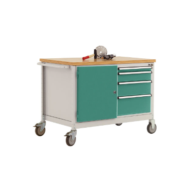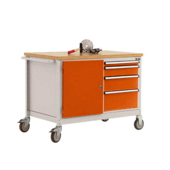 Banco da lavoro mobile BrigFox Modello 4 – banco da lavoro mobile con piano in multiplex da 30 mm, scomparto con porta e 4 casse