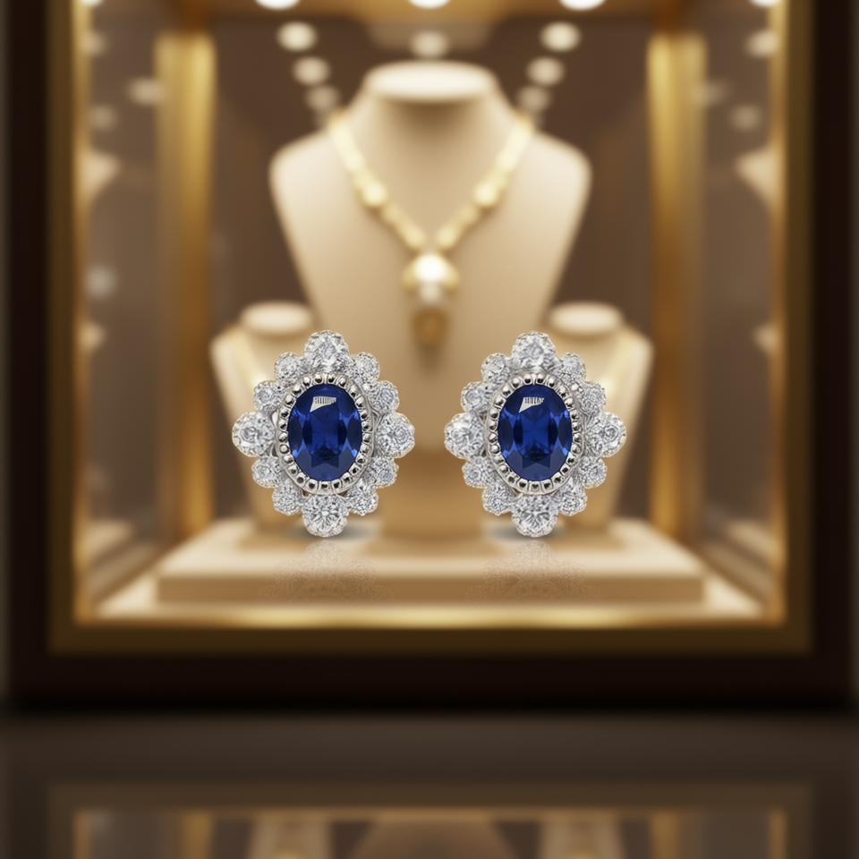 Bright Sapphire Blue Stud Earrings Oval Cut Flower Design Bezel Setting Women's Fashion Jewelry Alloy Material
