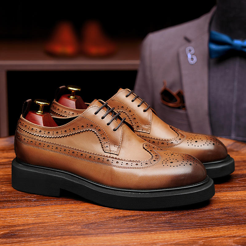 British Brogue Carved Lace-up Breathable Men's Shoes Thick Sole Height Increasing Groom Wedding Genuine Leather Business Formal