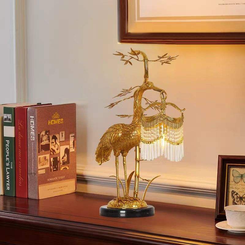 Bronze Crowned Crane Table Light Lampshade with Crystal Beads Tassels Dimmable Table Lamps Bedside Decoration Lighting